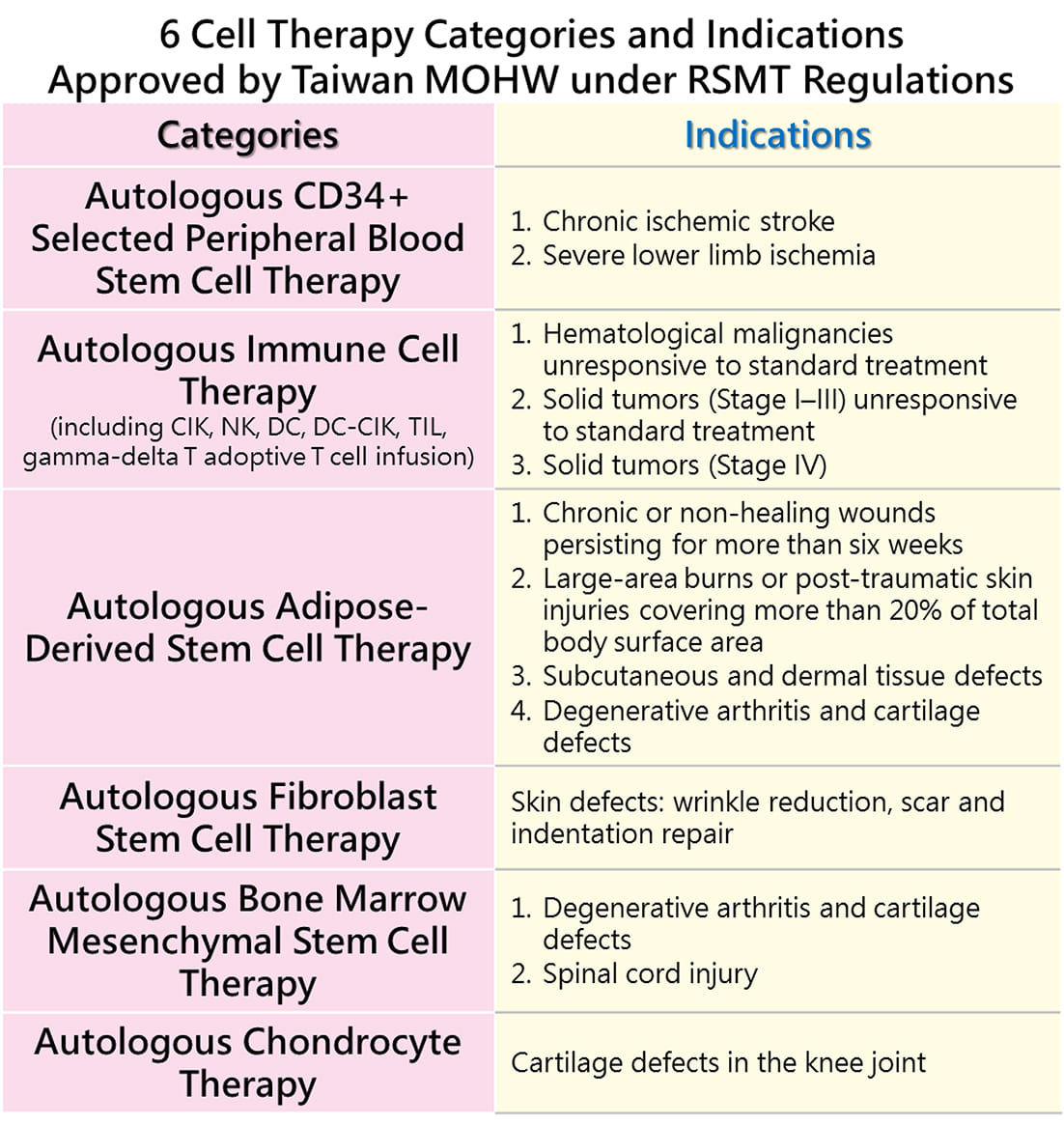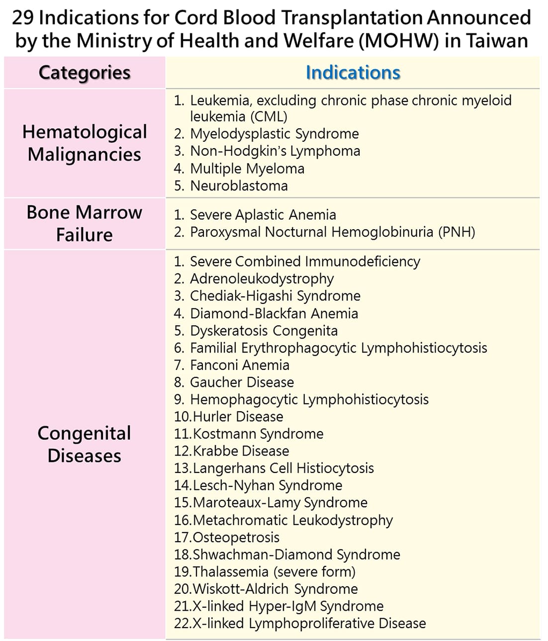 Approved treatments in Taiwan: The Ministry of Health and Welfare (MOHW) has authorized cord blood use in 29 indications, including blood, immune, malignant tumor, and metabolic disorders.